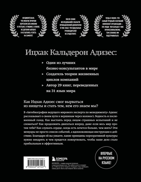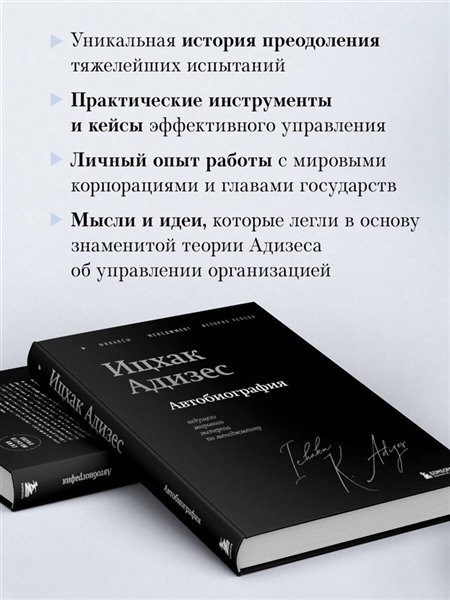 В «Автобиографии ведущего мирового эксперта по менеджменту» Адизес рассказывает о своем пути к вершинам через холокост, бедность и послевоенный голод. Как выстоять перед лицом страшных испытаний и не сломаться? Как продолжить двигаться вперед, даже если весь мир против тебя? Как слушать сердце, когда есть хочется больше, чем жить? Эти мемуары не просто список событий, а вдохновляющая инструкция к действию. Благодаря ей вы узнаете, какие принципы корпоративной культуры нужно внедрять и чем придется пожертвовать, чтобы ваше дело стало прибыльным и эффективным.