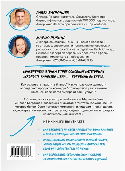 Об этом рассказывают авторы этой книги — Мария Рыбина и Павел Багрянцев, владельцы диджитал-агентстваTopYouТube Biz, которое более 10 лет помогаеткомпаниям и лидерам мнений делать видеомаркетинг частью их стратегии, получая подписчиков и продажи из любых социальных сетей.