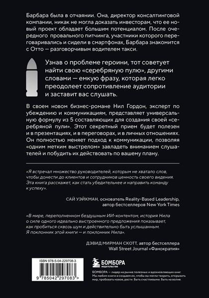 Барбара была в отчаянии. Она — директор консалтинговой компании — никак не могла доказать инвесторам, что ее новый проект обладает большим потенциалом. После очередногопровального питчинга, участники которого переговаривались и сидели в смартфонах, Барбара знакомится с Отто — разговорчивым водителем такси. Узнав о проблеме героини, тот советует найти свою «серебряную пулю», другими словами — емкую фразу, которая легко преодолеет сопротивление аудитории и заставит вас слушать. В своем новом бизнес-романе Нил Гордон, эксперт по убеждению и коммуникациям, представляет универсальную формулу из 5 составляющих для создания своей «серебряной пули». Этот секретный прием будет полезен и в презентациях, и в переговорах, и в личных отношениях. Он полностью меняет подход к коммуникации, позволяя «одним метким выстрелом» завладеть вниманием слушателей и побудить их действовать по вашему плану.