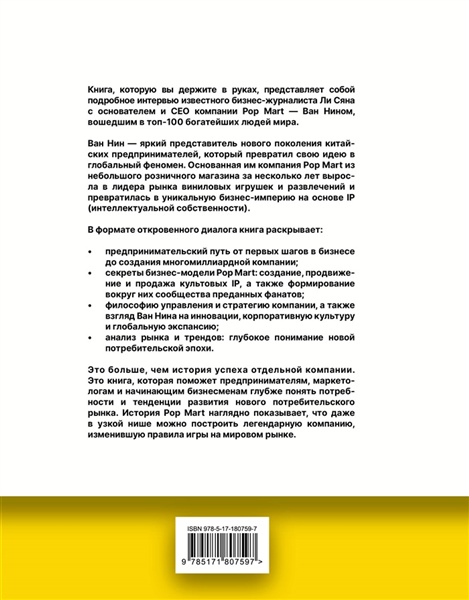 Книга, которую вы держите в руках, представляет собой подробное интервью известного бизнес-журналиста Ли Сяна с основателем и CEO компании Pop Mart — Ван Нином, вошедшим в топ-100 богатейших людей мира.