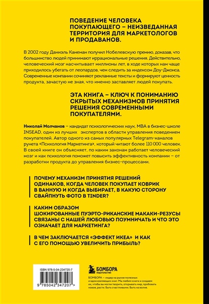 Победитель премии PwC «Деловая книга года в России»! Поведение человека покупающего — неизведанная территория для маркетологов и продаванов. В 2002 году Даниэль Канеман получил Нобелевскую премию, доказав, что большинство людей принимают иррациональные решения. Действительно, эволюция человеческого мозга насчитывает миллионы лет, в ходе которых нам чаще приходилось убегать от леопардов, чем следить за индексом Доу-Джонса. Современные компании сочиняют рекламные тексты и формируют ценность продукта, зачастую не зная, что именно заставляет людей покупать. Эта книга — ключ к пониманию скрытых механизмов принятия решения современными покупателями. Николай Молчанов — кандидат психологических наук, MBA в бизнес-школе INSEAD, один из лучших экспертов в области управления поведением покупателей. Автор одного из самых популярных Telegram-каналов Рунета «Психология маркетинга», который читают более 60 000 человек. В своей книге он объясняет, по каким законам работает человеческий мозг и как психология поможет повысить эффективность компании — от разработки продукта до управления бизнес-процессами. • Почему механизм принятия решений одинаков, когда человек покупает коврик в ванную и когда выбирает, в какую сторону свайпнуть фото в Tinder? • Каким образом шокированные пуэрториканские макаки-резусы связаны с нашей любовью поумничать и что это означает для маркетинга? • В чем заключается «эффект ИКЕА»и как с помощью него увеличить прибыль?