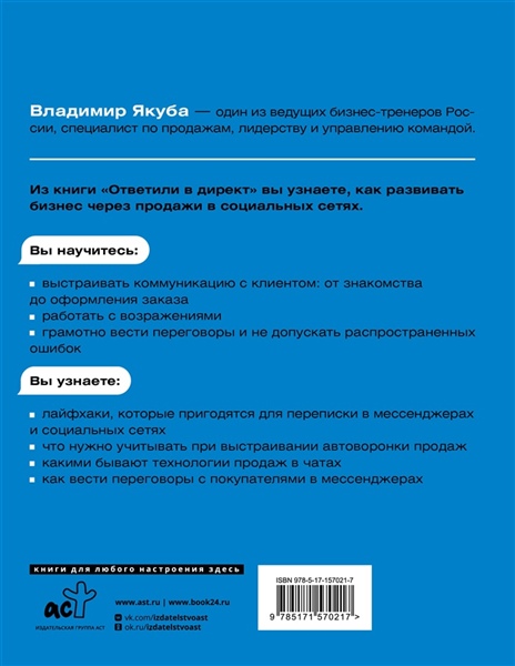 Владимир Якуба – один из ведущих бизнес-тренеров России, специалист по продажам, лидерству и управлению командой. Из книги "Ответили в директ" вы узнаете, как развивать бизнес через продажи в социальных сетях. Вы научитесь: -Выстраивать коммуникацию с клиентом: от знакомства до оформления заказа -Работать с возражениями -Грамотно вести переговоры и не допускать распространенных ошибок Вы узнаете: -лайфхаки, которые пригодятся для переписки в мессенджерах и социальных сетях -что нужно учитывать при выстраивании автоворонки продаж -какими бывают технологии продаж в чатах -как вести переговоры с покупателями в мессенджерах