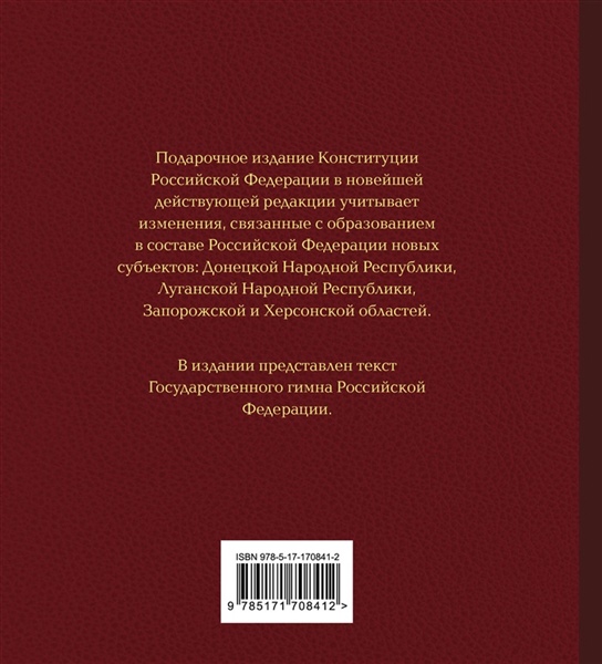 Подарочное издание Конституции Российской Федерации в новейшей действующей редакции учитывает изменения, связанные с образованием в составе Российской Федерации новых субъектов: Донецкой Народной Республики, Луганской Народной Республики, Запорожской и Херсонской областей. В издании представлены иллюстрации зданий государственных органов, памятников кремлевского зодчества, а также Государственный гимн Российской Федерации.