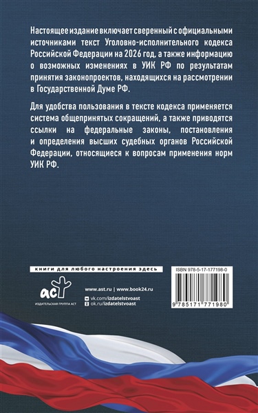 Данное издание Уголовно-исполнительного кодекса РФ сверено с официальным источником и приводится по состоянию на 2026 год. Кодекс учитывает все изменения, опубликованные в официальных источниках на момент подписания издания в печать. В издании представлена информация о возможных изменениях в УИК РФ по результатам принятия законопроектов, находящихся на рассмотрении в Государственной Думе РФ. Для удобства пользования в тексте кодекса применяется система общепринятых сокращений, а также приводятся ссылки на федеральные законы, постановления Правительства Российской Федерации, постановления и определения высших судебных органов Российской Федерации, относящиеся к вопросам применения норм УИК РФ.