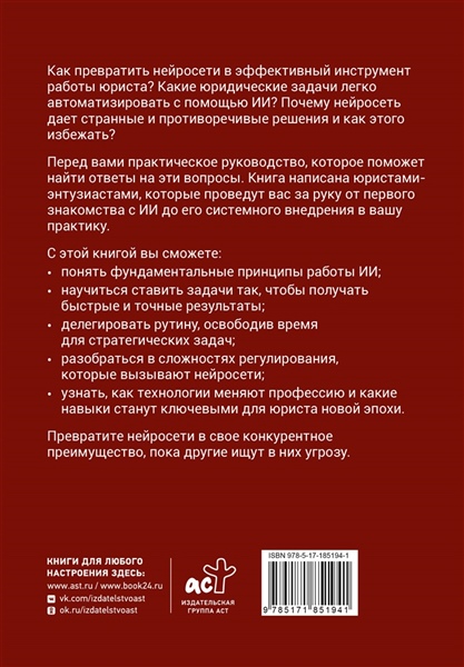 Перед вами практическое руководство, которое поможет найти ответы на эти вопросы. Книга написана юристами-энтузиастами, которые проведут вас за руку от первого знакомства с ИИ до его системного внедрения в вашу практику.