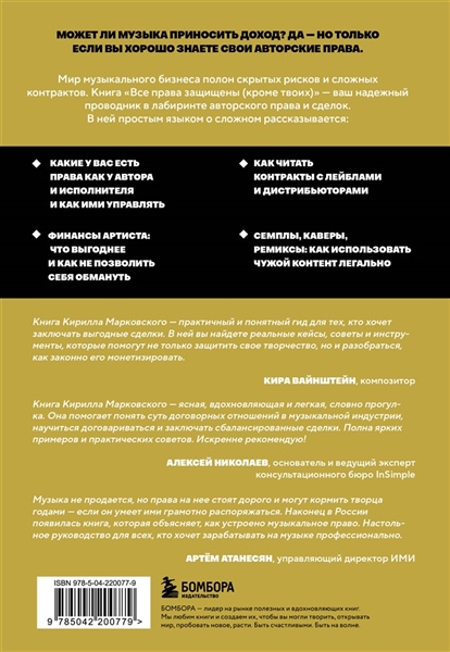 Книга подробно разбирает ключевые аспекты отрасли: от базовых институтов авторского права (воспроизведение, публичное исполнение, сообщение в эфир) до особенностей современных договоров с лейблами, издателями и дистрибьюторами. Отдельное внимание уделено вопросам семплирования, кавер-версий, управлению брендом артиста и выбору оптимальной юридической формы для творческой деятельности.