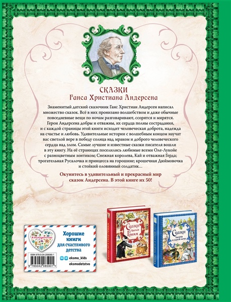 Красочные страницы раскрываются перед читателями, словно волшебный зонтик Оле-Лукойе, и мы понимаем: никто на свете не знает столько сказок, сколько знает их Ганс Христиан Андерсен. Созданные им образы знакомы с давних пор детям всего мира: холодно-бесстрастная Снежная королева, отважная и верная Герда, преданная Русалочка, трогательный Гадкий утёнок... Но в этой чудесной книге среди 50 сказок вы непременно найдёте ту, которую ещё не читали. И эта встреча обязательно станет для вас незабываемой.