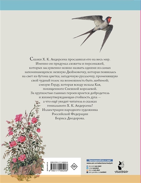 Сказки Х. К. Андерсена прославили его на весь мир. Именно он придумал сюжеты и персонажей, которых заслуженно можно назвать одними из самых запоминающихся: нежную Дюймовочку, которая появилась на свет из бутона цветка; загадочную русалочку, променявшую свой чудный голос на возможность быть любимой; смелую Герду, которая всюду искала Кая — мальчика, похищенного Снежной королевой. За хрупкостью главных героев кроется добродетель и жизнеутверждающая стойкость духа — а что ещё увидит читатель в сказках гениального Х. К. Андерсена? Иллюстрации народного художника Российской Федерации Бориса Диодорова. Для среднего школьного возраста.