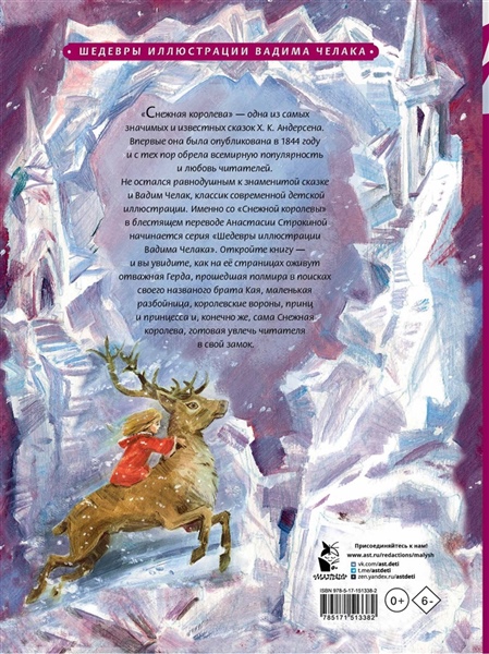 "Cнежная королева" — одна из самых значимых и известных сказок Х. К. Андерсена. Впервые она была опубликована в 1844 году и с тех пор обрела всемирную популярность и любовь читателей.Не остался равнодушным к знаменитой сказке и Вадим Челак, классик современной детской иллюстрации. Именно со "Снежной королевы" в блестящем переводе Анастасии Строкиной начинается серия "Шедевры иллюстрации Вадима Челака".