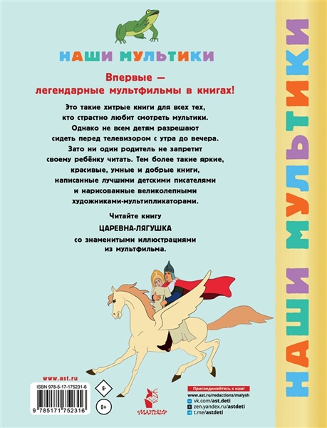 Сказка "Царевна-лягушка" — одна из многих любимых волшебных сказок детворы. В ней много приключений и небывалых подвигов главного сказочного героя — младшего царского сына Ивана-царевича. Сказка — ложь, да в ней намёк, добрым молодцам урок. Иллюстрации в книге из знаменитого мультфильма "Царевна-лягушка", который вышел на киностудии "Союзмультфильм" в 1954 году, а в 1960 году завоевал приз "Серебряный дубовый листок" на фестивале в Аргентине.