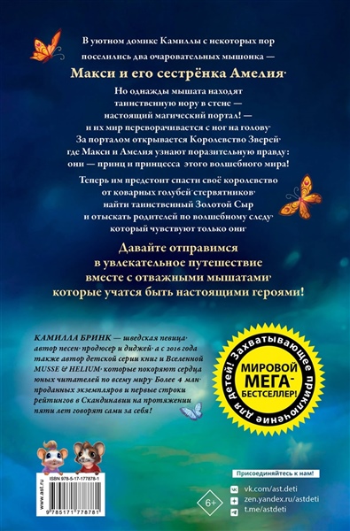 В уютном домике Камиллы с некоторых пор поселились два очаровательных мышонка — Макси и его сестрёнка Амелия. Но однажды мышата находят таинственную нору в стене — настоящий магический портал! — и их мир переворачивается с ног на голову. За порталом открывается Королевство Зверей, где Макси и Амелия узнают поразительную правду: они — принц и принцесса этого волшебного мира! Теперь им предстоит спасти своё королевство от коварных голубей-стервятников, найти таинственный Золотой Сыр и отыскать родителей по волшебному следу, который чувствуют только они. Давайте отправимся в увлекательное путешествие вместе с отважными мышатами, которые учатся быть настоящими героями! КАМИЛЛА БРИНК — шведская певица, автор песен, продюсер и диджей, а с 2016 года также автор детской серии книг и Вселенной Musse & Helium, которые покоряют сердца юных читателей по всему миру. Почти 4 млн. проданных экземпляров и первые строки рейтингов в Скандинавии на протяжении пяти лет говорят сами за себя!