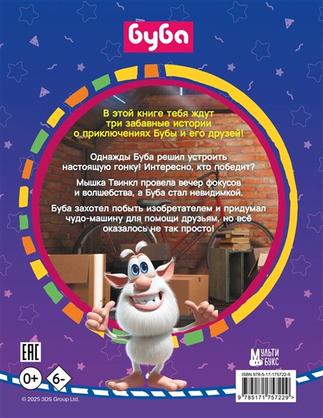 В этой книге тебя ждут три забавные истории о приключениях Бубы и его друзей! Однажды Буба решил устроить настоящую гонку! Интересно, кто победит? Мышка Твинкл провела вечер фокусов и волшебства, а Буба стал невидимкой. Буба захотел побыть изобретателем и придумал чудо-машину для сбора яблок, но всё оказалось не так просто!