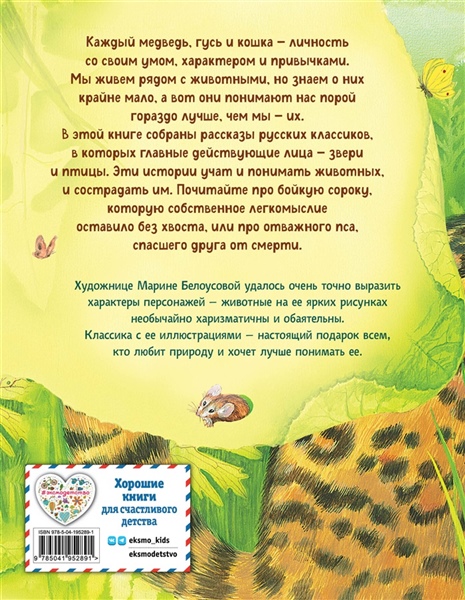 Нарядное издание в твёрдой обложке с тактильным эффектом. Удобный формат. Крупный шрифт. Полноцветные иллюстрации на каждой странице. В книгу вошли произведения выдающихся русских писателей: Антона Чехова, Александра Куприна, Михаила Пришвина, Дмитрия Мамина-Сибиряка и Константина Ушинского. Одиннадцать увлекательных рассказов посвящены зверям и птицам. Классики русской литературы умели тонко понимать не только людей, но и братьев наших меньших. Тем более, в привычках и поведении человека и остальных живых существ много общего. Как говорил Александр Куприн: «Никогда не верь тому, что тебе говорят дурного о животных». Ведь происходит это исключительно от нашего непонимания и невнимания к хвостатым и пернатым соседям. Каждая история в этом сборнике рассказывает об удивительных событиях из жизни животных, о причинах их поступков, учит любить и беречь природу. Книга станет отличным подарком для юных читателей, которые интересуются животными и стремятся лучше понимать их.