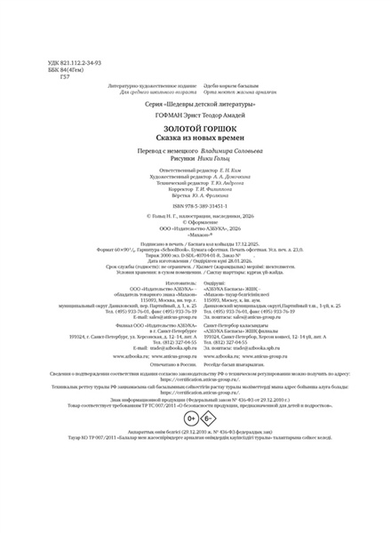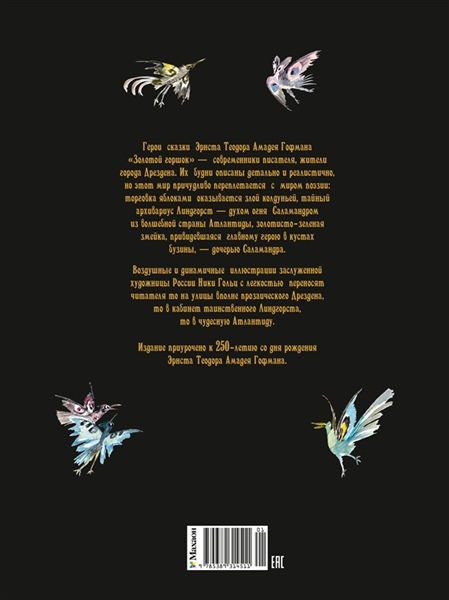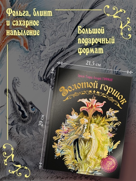 Героисказки Эрнста Теодора Амадея Гофмана «Золотой горшок» —современники писателя, жители города Дрездена. Ихбудни описаны детально и реалистично, но этот мир причудливо переплетаетсясмиром поэзии:торговка яблокамиоказывается злой колдуньей, тайный архивариус Линдгорст — духом огняСаламандром из волшебной страны Атлантиды, золотисто-зеленая змейка, привидевшаясяглавному герою в кустах бузины, — дочерью Саламандра. Воздушные и динамичныеиллюстрации заслуженной художницы России Ники Гольц переносят читателя то на улицы вполне прозаического Дрездена, то в кабинет таинственного Линдгорста, то в чудесную Атлантиду.