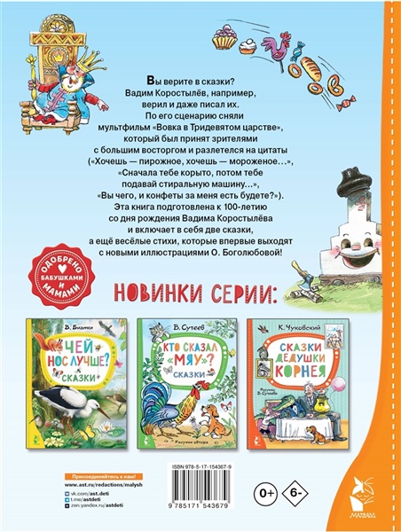 Есть на свете такие писатели, которые верят в чудо и волшебство. А ещё в сказку. Таким писателем и был В. Коростылёв — и именно об этом его произведения, по которым снимали фильмы и мультфильмы ("Вовка в Тридевятом царстве" — помните такой?). Издание подготовлено к 100-летию со дня рождения В. Коростылёва и включает в себя две сказки ("Вовка в Тридевятом царстве" и "Королева Зубная Щётка", написанная по мотивам сказки С. Могилевской), а ещё стихи, которые специально для этой книги проиллюстрировала О. Боголюбова — художник-график, художник-постановщик "Союзмультфильма" и Театра кукол имени С. В. Образцова. Для дошкольного возраста.