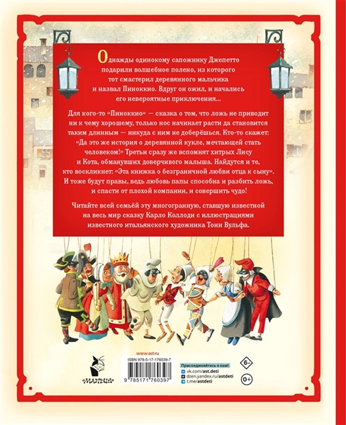 "Пиноккио", известная на весь мир сказка итальянского писателя Карло Коллоди (1826–1890), многогранна. Кто-то скажет, что она о лжи; другие с удовольствием почитают о приключениях деревянного мальчишки, который мечтал превратиться в настоящего человека, а третьи воскликнут: "Да это же история о безграничной отцовской любви!" В этом издании "Пиноккио" выходит в пересказе М. Михайлова, с рисунками известного итальянского художника Тони Вульфа, проиллюстрировавшего множество классических детских сказок и современных историй. Для детей до 3-х лет.