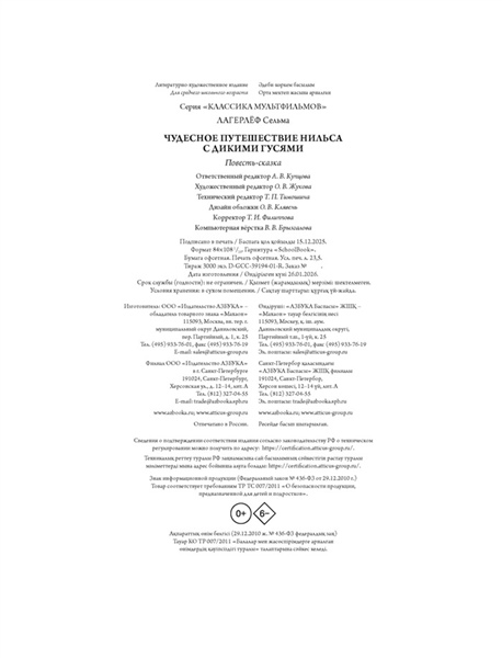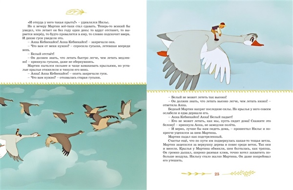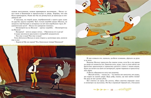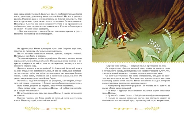 В чудесный миг волшебства персонажи замирают на книжных страницах. Сказка и анимация переплетаются, приглашая читателя в красочный мир любимых мультфильмов. Уникальное подарочное издание поможет сохранить это тёплое воспоминание из детства на своей книжной полке! Двенадцатилетний Нильс никого не боялся, пока не подшутил над лесным гномом. С тех пор жизнь его круто изменилась! Теперь он ростом не больше воробья, а когда ты настолько мал – всё кажется в два раза страшнее. Верхом на белом гусе заколдованному мальчику предстоит совершить головокружительное путешествие через всю страну: перехитрить коварного лиса, выстоять против целого войска и даже встретиться с королём! И всё для того, чтобы развеять чары. Удастся ли мальчишке снять заклятие? Ведь Нильс, на свою беду, успел нажить недобрую славу среди зверей и птиц…