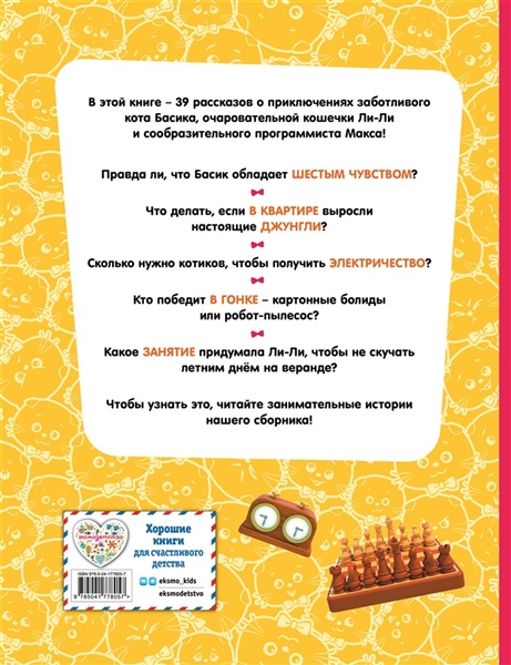 Встречайте героев любимого мультсериала в книжном формате! Текст адаптирован для детского восприятия, а красочные иллюстрации из мультфильма захватывают внимание ребёнка с первой страницы. В книге собрано 39 увлекательных рассказов про сообразительного кота Басика, милую кошечку Ли-Ли и жизнерадостного программиста Макса. Сколько нужно котиков, чтобы добыть электричество? Правда ли, что Басик обладает шестым чувством? Кто победит в гонке — картонные болиды или робот-пылесос? Чтобы узнать это, читайте весёлые и занимательные рассказы из нашего сборника! Книги серии «Кот Басик. Официальные издания» — это отличная альтернатива просмотру мультфильмов. Подходит как для совместного, так и для первого самостоятельного чтения. Читайте поучительные истории с любимыми героями из мультфильма «Кот Басик» и прививайте малышу любовь к чтению с самых ранних лет!