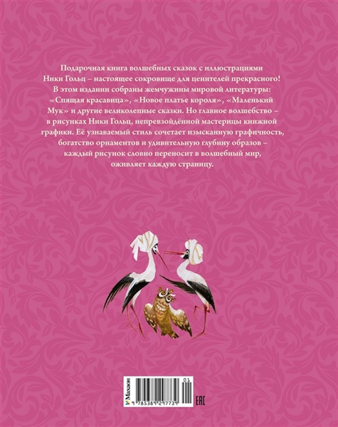 Подарочная книга волшебных сказок с иллюстрациями Ники Гольц — настоящее сокровище для ценителей прекрасного! В этом издании собраны жемчужины мировой литературы: «Спящая красавица», «Новое платье короля», «Маленький Мук» и другие великолепные сказки. Но главное волшебство — в рисунках Ники Гольц, непревзойдённой мастерицы книжной графики. Её узнаваемый стиль сочетает изысканную графичность, богатство орнаментов и удивительную глубину образов — каждый рисунок словно переносит в волшебный мир, оживляет каждую страницу.