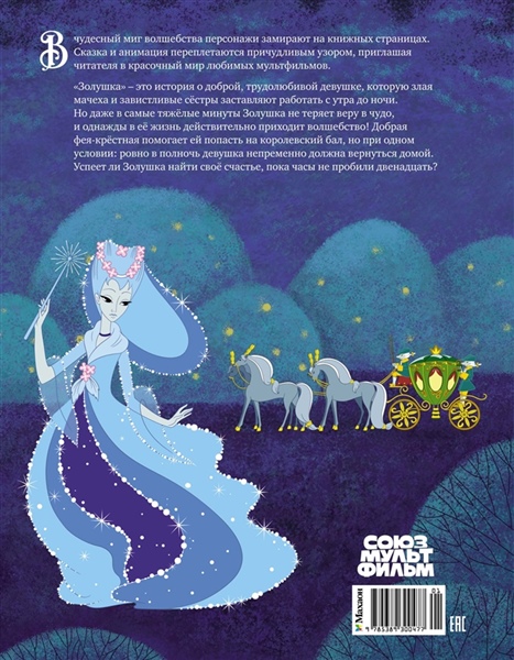 В чудесный миг волшебства персонажи замирают на книжных страницах. Сказка и анимация переплетаются причудливым узором, приглашая читателя в красочный мир любимых мультфильмов. «Золушка» – это история о доброй, трудолюбивой девушке, которую злая мачеха и завистливые сёстры заставляют работать с утра до ночи. Но даже в самые тяжёлые минуты Золушка не теряет веру в чудо, – и однажды в её жизнь действительно приходит волшебство! Добрая фея-крёстная помогает ей попасть на королевский бал, но при одном условии: ровно в полночь девушка непременно должна вернуться домой. Успеет ли Золушка найти своё счастье, пока часы не пробили двенадцать?