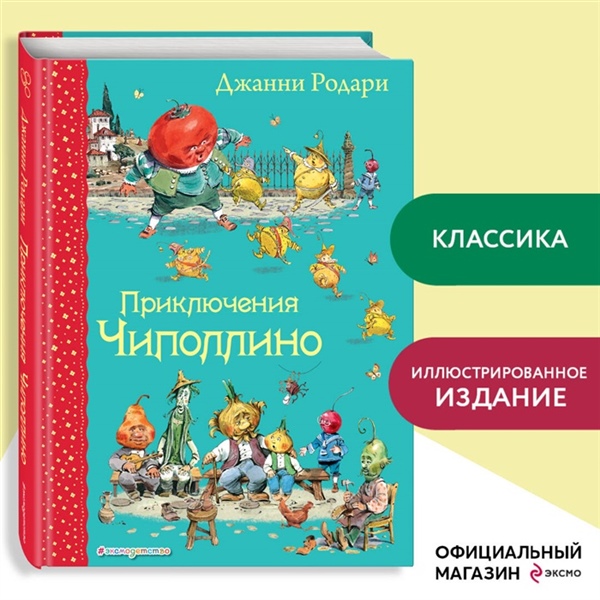 Известная сказка итальянского писателя Джанни Родари, рассказывающая о приключениях мальчика-луковки в фруктово-овощной стране. Среди персонажей сказки Кавалер Помидор, Графини Вишни,Кум Тыква.Сказка в классическом переводе Златы Потаповой выходит с прекрасными, тонкими и ироничнымииллюстрациями Вадима Челака. Для читателей среднего школьного возраста.