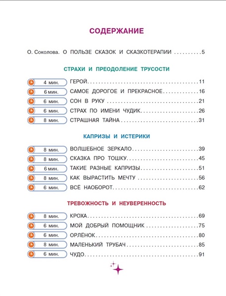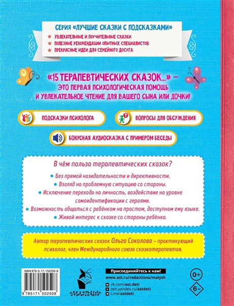 В этой книге собраны 15 сказочных историй, которые помогут вашему малышу легко и быстро справиться с различными психологическими трудностями. Все сказки написаны опытным психологом-сказкотерапевтом Ольгой Соколовой и затрагивают важные проблемы воспитания и взросления: страхи, капризы и истерики, тревожность. На примере героев сказок — милых зверят и непоседливых мальчишек и девчонок — ребята научатся поддерживать отличное настроение, понимать свои страхи и укрощать их, узнают, чем опасны капризы. Эта книга поможет вам наладить доверительные отношения со своим сыном или дочкой, лучше узнать об их затаённых обидах и страхах. Иллюстрации Анастасии Зининой украсят путешествие в страну лечебных сказок и сделают чтение ещё интереснее.