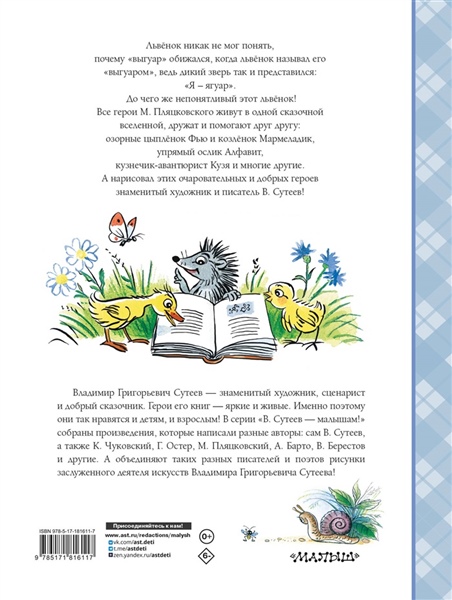 Сказки М. Пляцковского занимают особое место в детской литературе: писатель создал целую вселенную, герои которой — зверята, каждый со своим уникальным характером. Вместе они попадают в увлекательные приключения, учатся дружить и помогать своим близким. В книгу вошли сказки "Солнышко на память", "Разноцветные зверята", "Ромашки в январе" и многие другие, а также сказочная повесть "Дневник кузнечика Кузи", все произведения в иллюстрациях В. Сутеева. В серию "В. Сутеев — малышам!" вошли произведения К. Чуковского, А. Барто, В. Берестова, М. Пляцковского, самого В. Сутеева и многих других. Иллюстрации к книгам нарисовал В. Сутеев. Для дошкольного возраста.