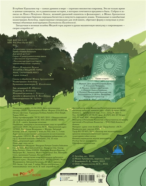 Уникальные и самобытные иллюстрации Антейку, нарисованные специально для этой книги, обретают форму в искусных и утонченных объемных конструкциях Екатерины Казейкиной. Загадочная и великая хозяйка Медной горы держит в руках малахитовую шкатулку с сокровищами – скорее откройте ее!