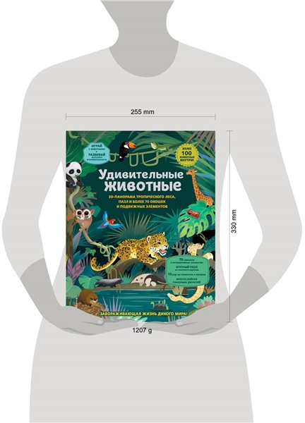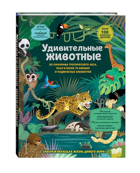 Ответить на все вопросы тебе помогут познавательные окошки, подвижные элементы у разнообразных животных, а также великолепная панорама джунглей! Скорее открывай все окошки — будет интересно!