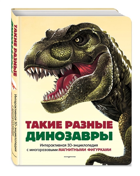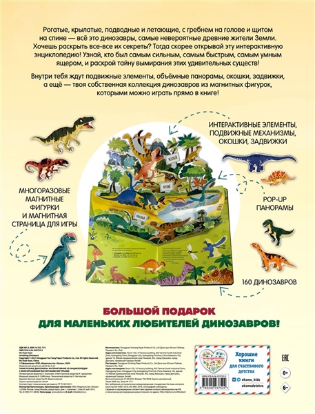 Интерактивная 3D-энциклопедия о динозаврах для малышей. Многоразовые магнитные фигурки и игровые элементы: pop-up панорамы, окошки, клапаны, задвижки. Соберите свою коллекцию фигурок-динозавров!