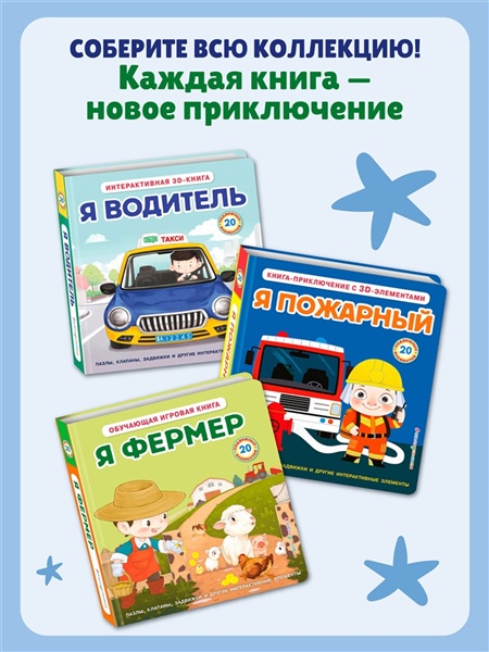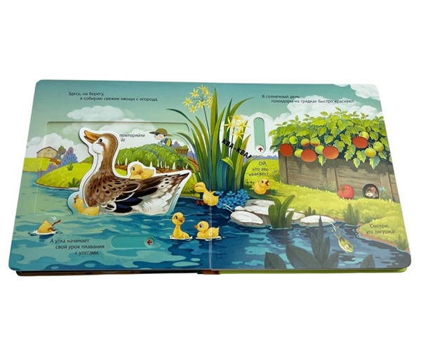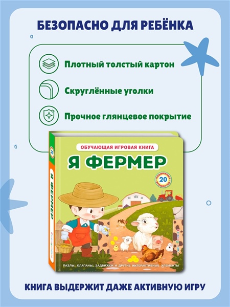 20 интерактивных элементов в одной книге-развивашке! Пазлы, клапаны, задвижки, которые можно двигать, крутить, вынимать из книжки. Прочная и безопасная конструкция: твёрдая обложка, скруглённые углы, толстые картонные страницы с глянцевым лакированием, которые ребёнок сможет сам легко переворачивать. Только безопасные материалы!