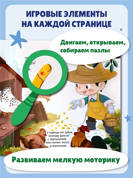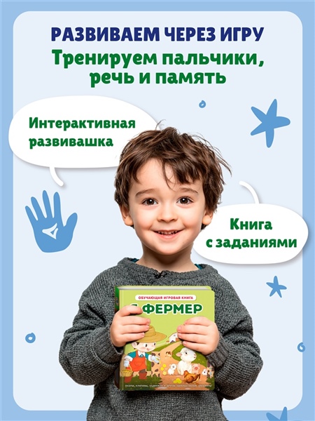 Данная развивающая книга отлично подходит для детей 3—4 лет. Интерактивные элементы помогают в развитии мелкой моторики. Тренируем пальчики, речь и память!