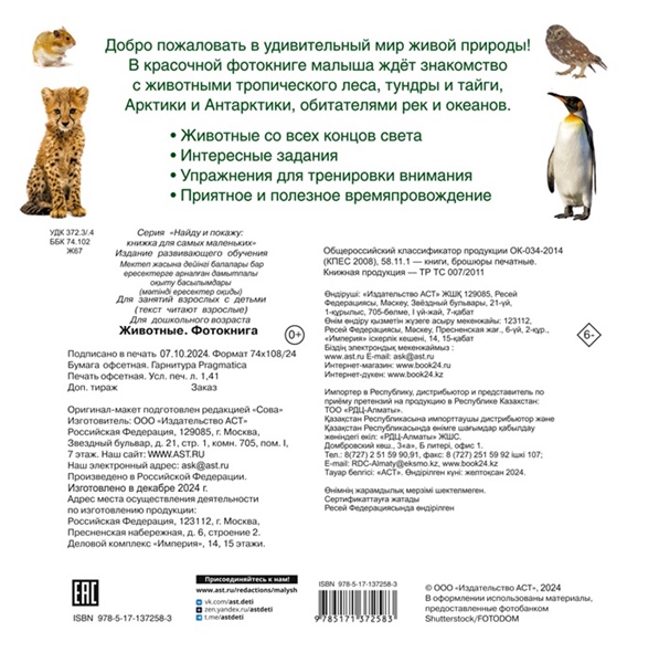 "Животные. Фотокнига" — это книжка с увлекательными заданиями для малышей. На страницах фотокниги — красочные изображения домашних животных, обитателей тропиков, океанов и рек, представителей фауны тайги и тундры. Находя и показывая картинки, дети смогут развить внимание, а заодно сделают первые шаги в изучении фауны нашей планеты. Для дошкольного возраста.