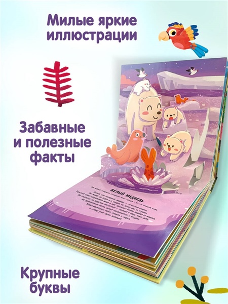 Текст в книге написан крупными буквами, а в названиях животных проставлены ударения. Это делает издание идеальным как для совместного чтения с ребенком, так и для самостоятельного прочтения подросшим малышом.