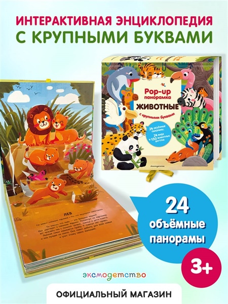 Подарочная интерактивная энциклопедия-панорамка про животных мира! Самая объемная книга с 3D-конструкциями на каждом из 24 разворотов.