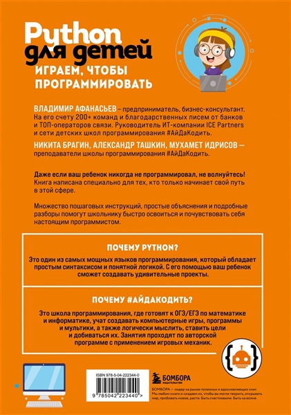 «Python для детей. Играем, чтобы программировать» ВЛАДИМИР АФАНАСЬЕВ — предприниматель, бизнес-консультант. На его счету 200+ команд и благодарственные письма от банков и ТОП-операторов связи. Руководитель ИТ-компании ICE Partners и сети детских школ программирования #АйДаКодить. НИКИТА БРАГИН, АЛЕКСАНДР ТАШКИН, МУХАМЕТ ИДРИСОВ — преподаватели школы программирования #АйДаКодить. Даже если ваш ребенок никогда не программировал, не волнуйтесь! Книга написана специально для тех, кто только начинает свой путь в этой сфере. Множество пошаговых инструкций, простые объяснения и подробные разборы помогут школьнику быстро освоиться и почувствовать себя настоящим программистом. Почему Python? Это один из самых мощных языков программирования, который обладает простым синтаксисом и понятной логикой. С его помощью ваш ребенок сможет создавать удивительные проекты. Почему #АйДаКодить? Это школа программирования, где готовят к ОГЭ/ЕГЭ по математике и информатике, учат создавать компьютерные игры, программы и мультики, а также логически мыслить, ставить цели и добиваться их. Занятия проходят по авторской программе с применением игровых механик.