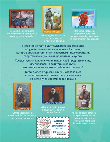 Отправляйтесь в захватывающее путешествие по разным эпохам нашей страны! Вы хотите познакомить вашего ребёнка с известными людьми России — Павлом Нахимовым и Александром Покрышкиным, Михаилом Лермонтовым и Александром Вертинским, Николаем Пироговым и Всеволодом Бобровым? Узнать, во что играли будущие великие личности? Чем увлекались в детстве? Как искали свою судьбу, искали себя на нелёгких жизненных дорогах? Ведь они так же, как и все мы, одолевали за партой неподдающиеся науки, отстаивали собственное мнение в спорах; у них были свои детские огорчения и радости. И далеко не всё получалось с первого раза... Тогда открывайте эту книгу! В каждом из 20 биографических рассказов, адаптированных для детей 7—10 лет, — невероятный образец силы воли и стойкости характера, мотивирующий ребят на собственные свершения. Их сопровождают красочные полосные иллюстрации и занимательные факты, чтобы знакомиться с выдающимися соотечественниками было наглядно и увлекательно. А ещё это неповторимый подарок для всех, кто гордится историей и культурой своего Отечества! Книги серии получили заслуженно высокую оценку — в 2024 году они были номинированы на премию Российского общества «Знание» в категории «Лучшая просветительская книга».