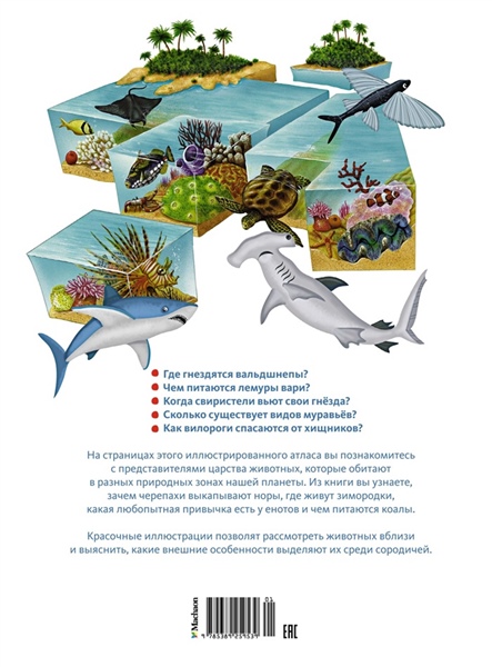 Где гнездятся вальдшнепы? Чем питаются лемуры вари? Когда свиристели вьют свои гнёзда? Сколько существует видов муравьёв? Как вилороги спасаются от хищников? На страницах этого иллюстрированного атласа вы познакомитесь с представителями царства животных, которые обитают в разных природных зонах нашей планеты. Из книги вы узнаете, зачем черепахи выкапывают норы, где живут зимородки, какая любопытная привычка есть у енотов и чем питаются коалы. Красочные иллюстрации позволят рассмотреть животных вблизи и выяснить, какие внешние особенности выделяют их среди сородичей.