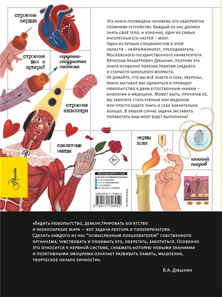 Книга замечательных ученых и популяризаторов науки Вячеслава Дубынина и Игоря Сергеева расскажет юному читателю о самом интересном на свете - о человеке. Изучать тело и мозг человека школьникам помогут и лекции Вячеслава Дубынина, ссылки на которые в виде QR-кодов представлены в книге. Для среднего и старшего школьного возраста.