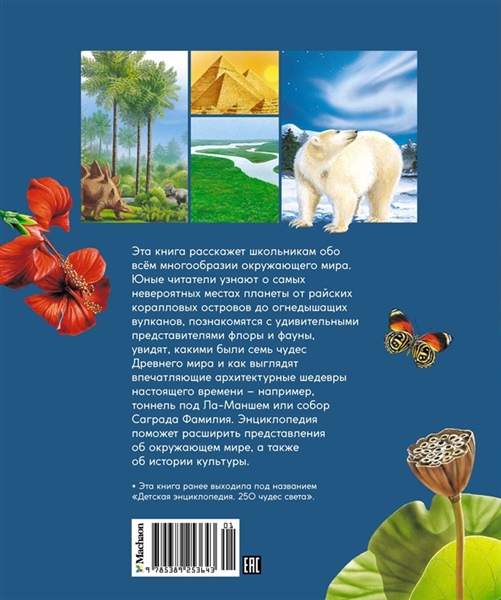 Эта книга расскажет школьникам обо всём многообразии окружающего мира. Юные читатели узнают о самых невероятных местах планеты от райских коралловых островов до огнедышащих вулканов, познакомятся с удивительными представителями флоры и фауны, увидят, какими были семь чудес Древнего мира и как выглядят впечатляющие архитектурные шедевры настоящего времени – например, тоннель под Ла-Маншем или собор Саграда Фамилия. Энциклопедия поможет расширить представления об окружающем мире, а также об истории культуры.