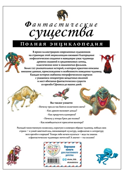 В ярких иллюстрациях современных художников на страницах этой энциклопедии оживают благородные мифологические создания и наводящие ужас чудовища древних сказаний и средневековых легенд, классических книг и знаменитых фильмов. Более 120 увлекательных историй, в которых красочно описаны внешние данные, происхождение и особенности поведения чудовищ.