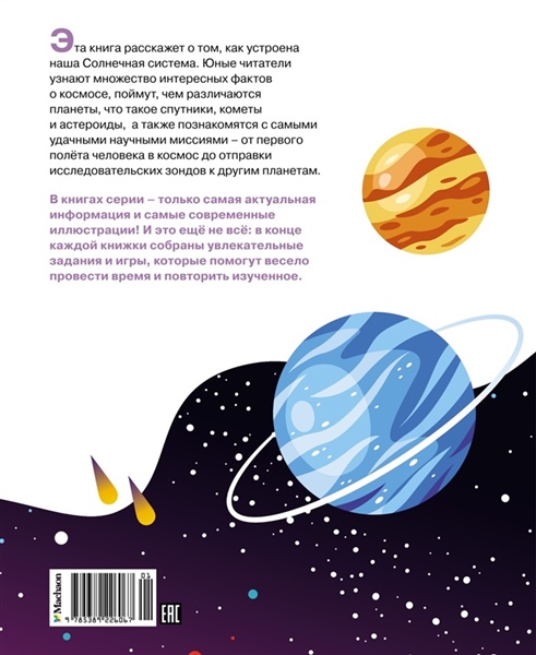 Эта книга расскажет о том, как устроена наша Солнечная система. Юные читатели узнают множество интересных фактов о космосе, поймут, чем различаются планеты, что такое спутники, кометы и астероиды, а также познакомятся с самыми удачными научными миссиями – от первого полёта человека в космос до отправки исследовательских зондов к другим планетам. В книгах серии – только самая актуальная информация и самые современные иллюстрации! И это ещё не всё: в конце каждой книжки собраны увлекательные задания и игры, которые помогут весело провести время и повторить изученное.