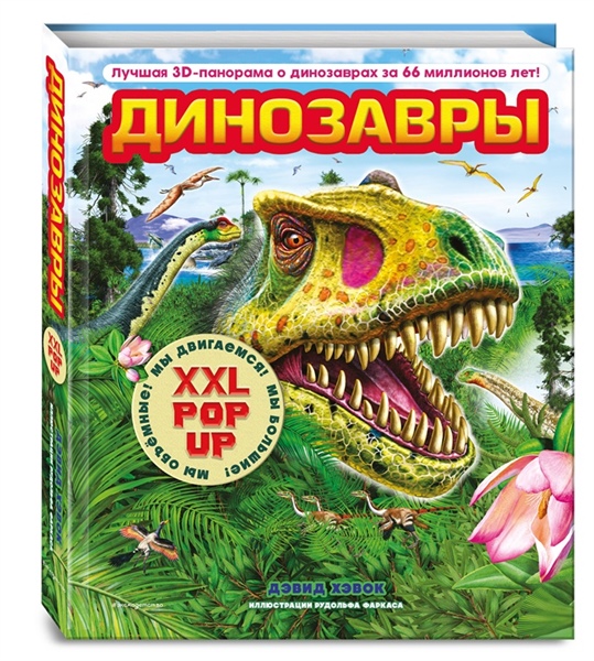 Внутри — 34 вида динозавров и 39 объемных pop-up фигур, которые встают навстречу читателю при открывании страниц и боковых клапанов. Реалистичные иллюстрации венгерского художника Рудольфа Фаркаса делают издание по-настоящему эффектным и запоминающимся.
