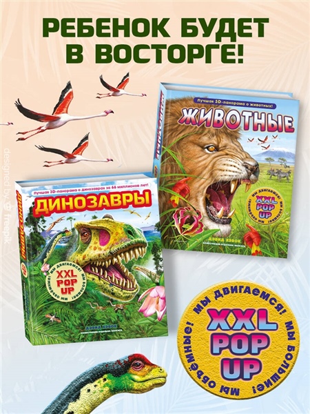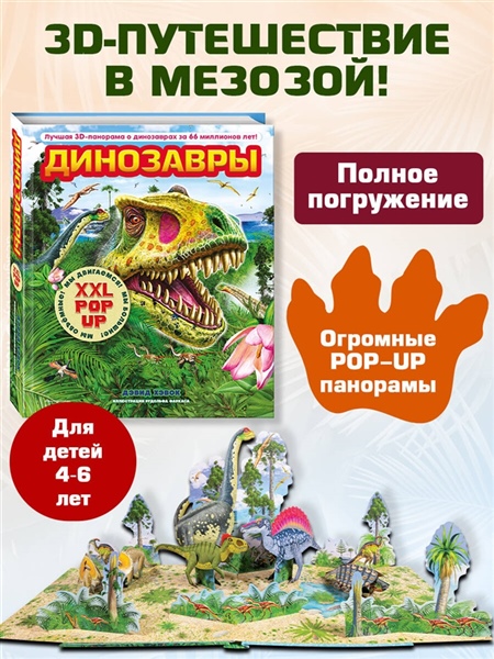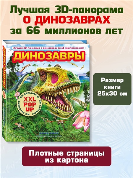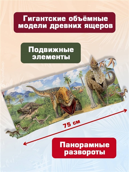 Каждый разворот — отдельный уголок древней Земли, в котором обитают гигантские ящеры. Объемные фигуры динозавров, подвижные элементы и боковые клапаны показывают, как жили динозавры в разные периоды, чем питались, как охотились и защищались.