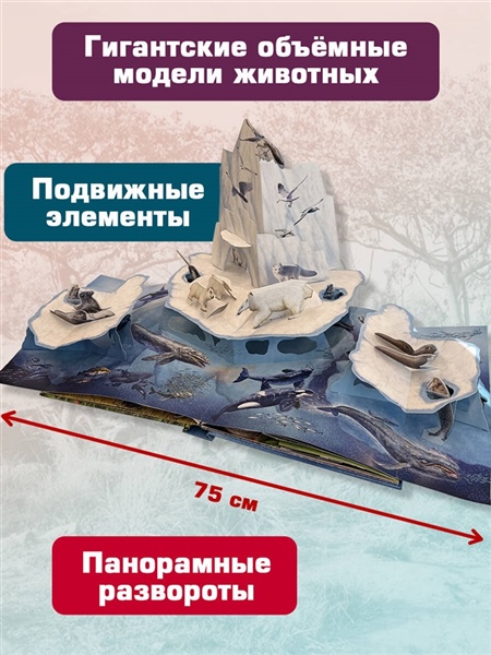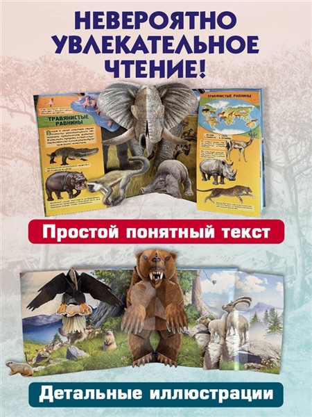 Всё, что нужно знать об обитателях лесов, саванн, арктических областей и океанов, в одной интерактивной книге! Откройте мир этого подарочного издания, в котором животные оживают прямо на страницах. Интерактивная XXL энциклопедия о животных — это яркая детская энциклопедия с pop-up элементами, которые превращают чтение в увлекательное исследование мира природы. Каждый разворот книги представляет отдельный уголок загадочного животного царства. Здесь вы узнаете, где обитают, чем питаются и как заботятся о потомстве животные со всего света. В книге представлено более 20 видов животных, которые скрываются под боковыми клапанами и поднимаются навстречу читателю при открытии страниц. Реалистичные иллюстрации венгерского художника Рудольфа Фаркаса делают издание по-настоящему эффектным и запоминающимся. Благодаря большому формату, красочному оформлению и безопасным качественным материалам эта интерактивная pop-up книга о животных станет отличным подарком для юных любителей животных. А простой и занимательный текст подходит для восприятия детьми 4—7 лет.