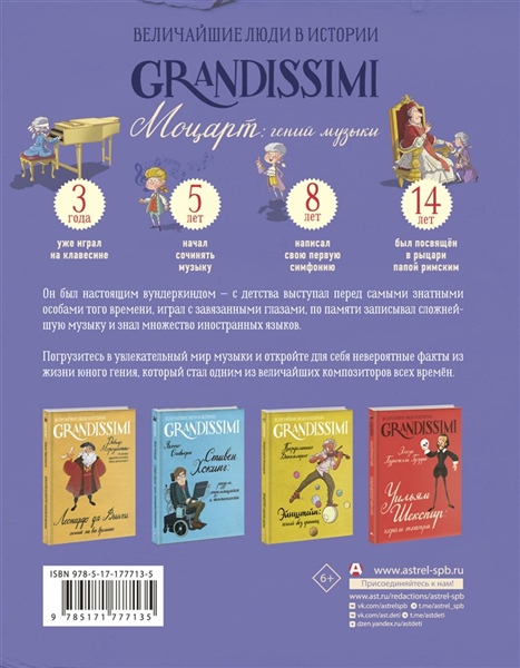Вольфганг Амадей Моцарт — в три года уже играл на клавесине; — в пять лет начал сочинять музыку; — в восемь — написал свою первую симфонию; — в четырнадцать был посвящён в рыцари папой римским! Он был настоящим вундеркиндом — с детства выступал перед самыми знатными особами того времени, играл с завязанными глазами, по памяти записывал сложнейшую музыку и знал множество иностранных языков. Погрузитесь в увлекательный мир музыки и откройте для себя невероятные факты из жизни юного гения, который стал одним из величайших композиторов всех времён.
