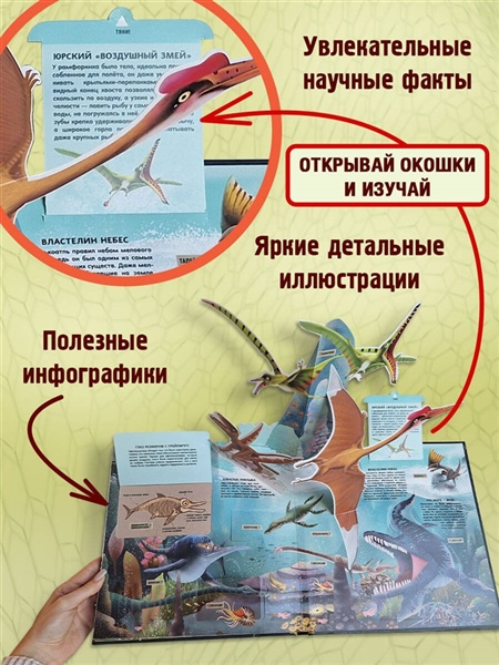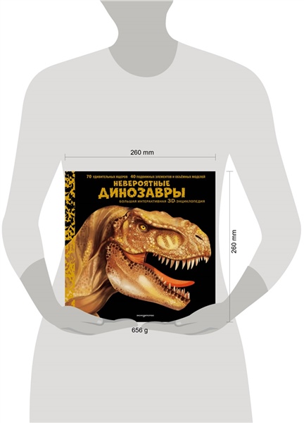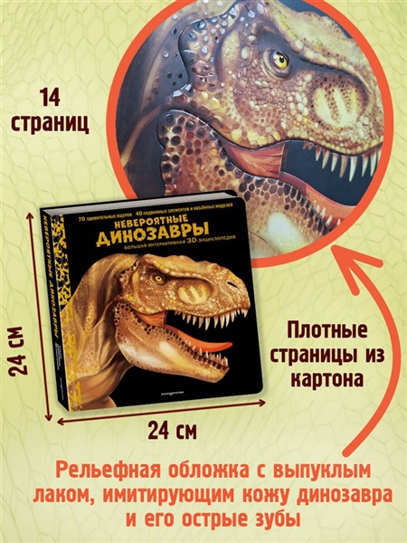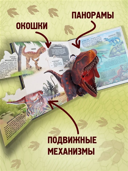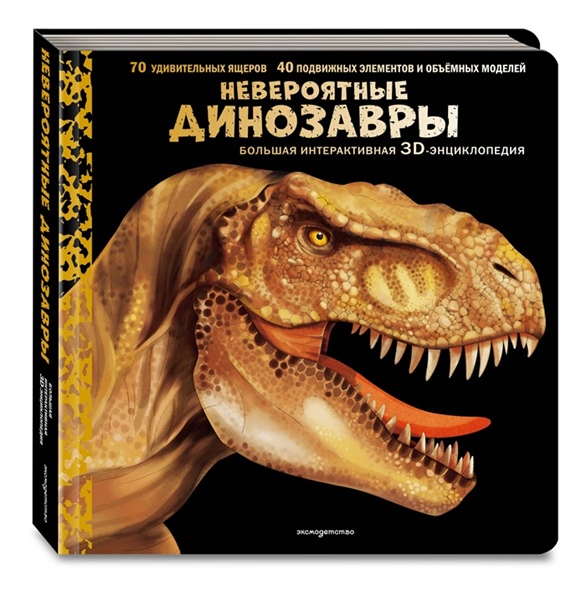 Большая интерактивная 3D-энциклопедия с подвижными элементами, pop-up панорамами, окошками, клапанами, задвижками. Только самые интересные факты о динозаврах в ярком подарочном издании с роскошной обложкой!