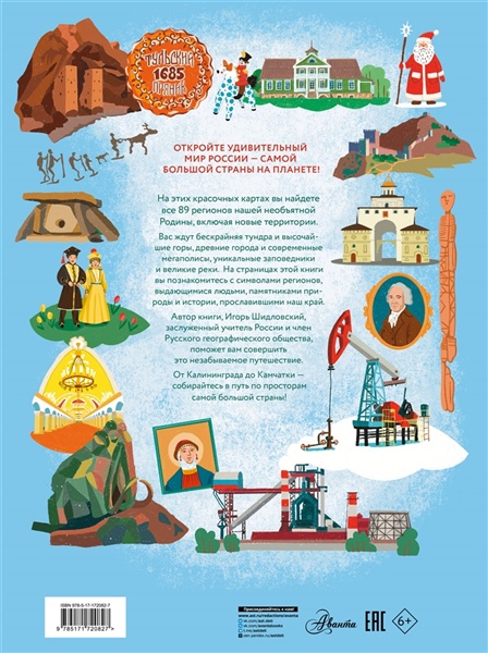 Знаете ли вы, какая страна на планете самая большая? Отправляйтесь в захватывающее путешествие по России вместе с этой уникальной книгой! 89 ярких и детальных инфографических карт откроют для вас все регионы нашей необъятной Родины: от Калининграда до Камчатки. Вы узнаете самые удивительные факты: где находятся каменные великаны высотой с 15-этажный дом и горячие источники рядом с вулканами, в какой республике делают вкуснейший сыр и живёт горный зубр, где можно увидеть цветущие лотосы и самую северную пустыню мира. Каждый разворот книги — это новый регион с его главными символами, знаменитыми людьми, памятниками природы и культуры, важными историческими датами и даже местными легендами. Книга создана для юных исследователей и их родителей. Автор, заслуженный учитель России и лауреат премии Русского географического общества Игорь Шидловский, достоверно и увлекательно рассказывает о географии. А художник Анна Суворова, специалист по каллиграфии и леттерингу, наполняет каждую страницу особыми, "рукотворными" иллюстрациями, превращая карты в настоящие художественные открытки. Поразительное разнообразие природы, городов, традиций и народов — всё это в одной книге. Начните своё большое путешествие по самой большой стране!