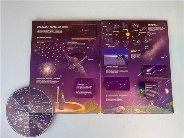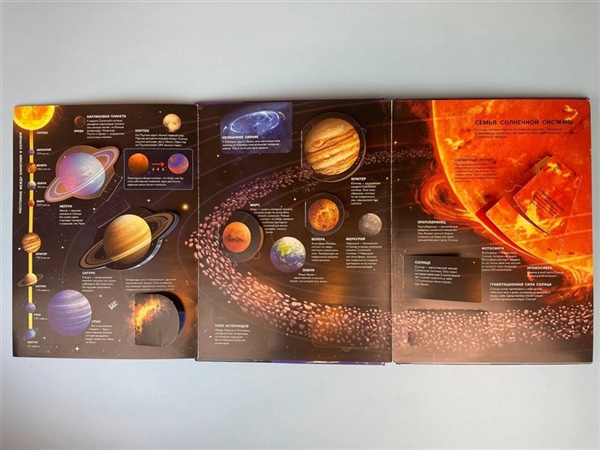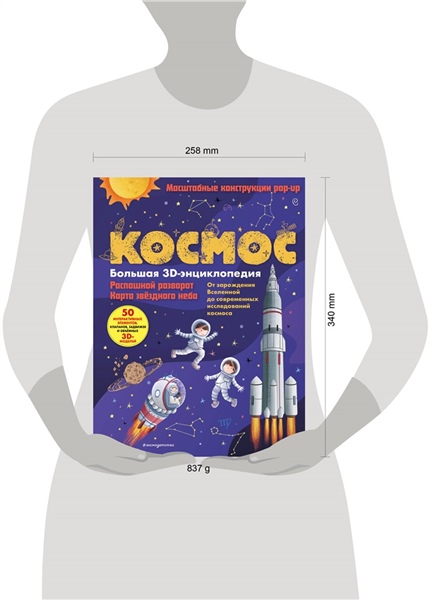 Большая энциклопедия о космосе с подвижными деталями и масштабными конструкциями pop-up! Интерактивные элементы разных форм и принципов действия: объёмные 3D-панорамы, множество клапанов, встроенные раскладные детали, карта звёздного неба, распашной разворот. Самая интересная информация о нашей Вселенной — от Большого взрыва до современных исследований космоса. Надёжно и качественно: большой формат, твёрдый переплёт, страницы из плотного картона. Хочешь совершить настоящее космическое путешествие? Тогда садись поудобней и открывай эту книгу. С ней ты отправишься к бескрайним галактикам, увидишь звёзды, планеты и астероиды, побываешь на настоящем космическом корабле и вместе с астрономами посмотришь на самые известные созвездия. На каждой страничке ты найдёшь реалистичные иллюстрации, подвижные детали, клапаны, объёмные панорамы, которые сделают твоё путешествие наглядным и по-настоящему захватывающим.