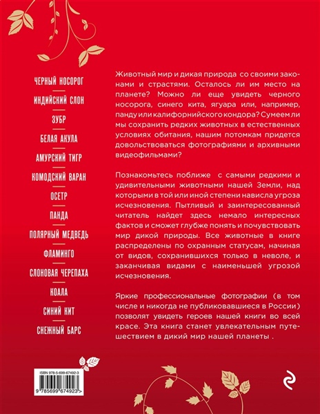 Познакомьтесьс удивительным миром животных нашей Земли, занесенных в Красную книгу.Узнайте об их привычках и поведении, нежных чувствах и бурных эмоциях, семейных устоях и индивидуальных потребностях, об опасностях и угрозах, которые встречаются на пути братьев наших меньших и о многом другом.Яркие профессиональные фотографии позволят увидеть героев нашей книги во всей красе. Эта книга станет не просто научным пособием для изучения животного мира, но увлекательным путешествием в природу Земли.
